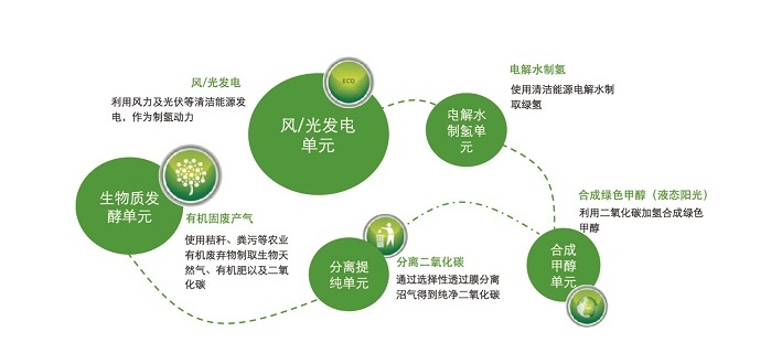 風光生物質(zhì)聯(lián)合制儲氫(液態(tài)陽光)一體化碳中和技術是國能中電以國家“雙碳”目標為指引,在自身優(yōu)勢的生物質(zhì)能技術基礎之上,打破產(chǎn)業(yè)壁壘,融通產(chǎn)業(yè)鏈條,成功孵化的以風能、太陽能、生物質(zhì)能、氫能等清潔能源為代表的一體化碳中和項目,該項目主要包括風力發(fā)電單元、電解水制氫單元、生物質(zhì)發(fā)酵產(chǎn)氣單元、合成甲醇單元,在消納秸稈等有機固廢的同時,利用清潔能源為氫能產(chǎn)業(yè)提供綠色甲醇,通過能源循環(huán)利用最終實現(xiàn)碳中和。該項目建立了全新的清潔能源產(chǎn)業(yè)鏈協(xié)同利用模式,是國能中電碳中和路徑的有益實踐,也是我國能源結(jié)構(gòu)重整的創(chuàng)新之舉。